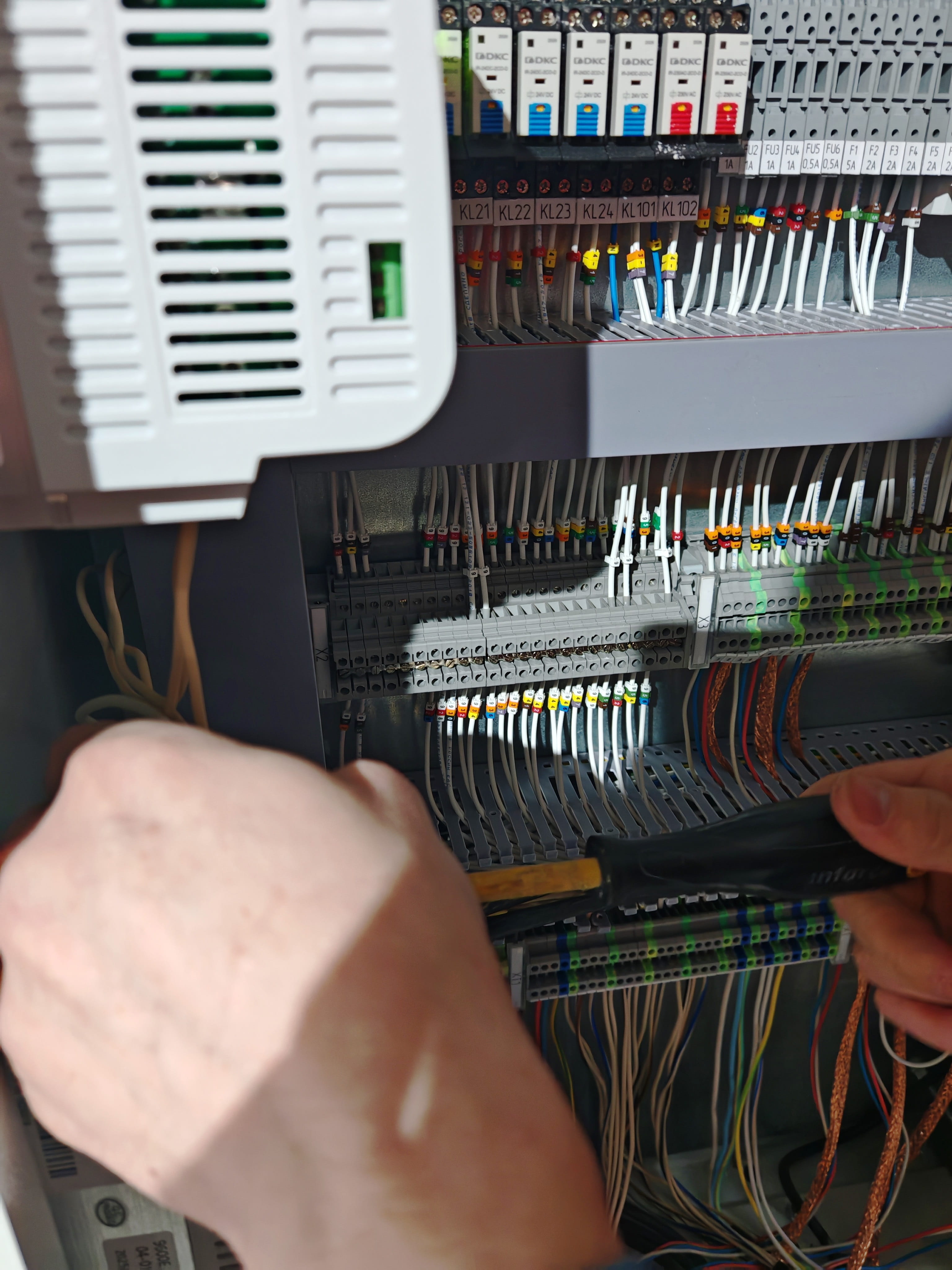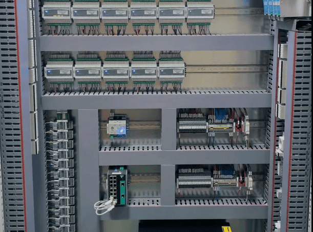 - Визуальный осмотр состояния шкафов управления, контроллеров, модулей, клеммных соединений, кабельных линий, заземления. Проверка соответствия фактических схем проектной документации.
